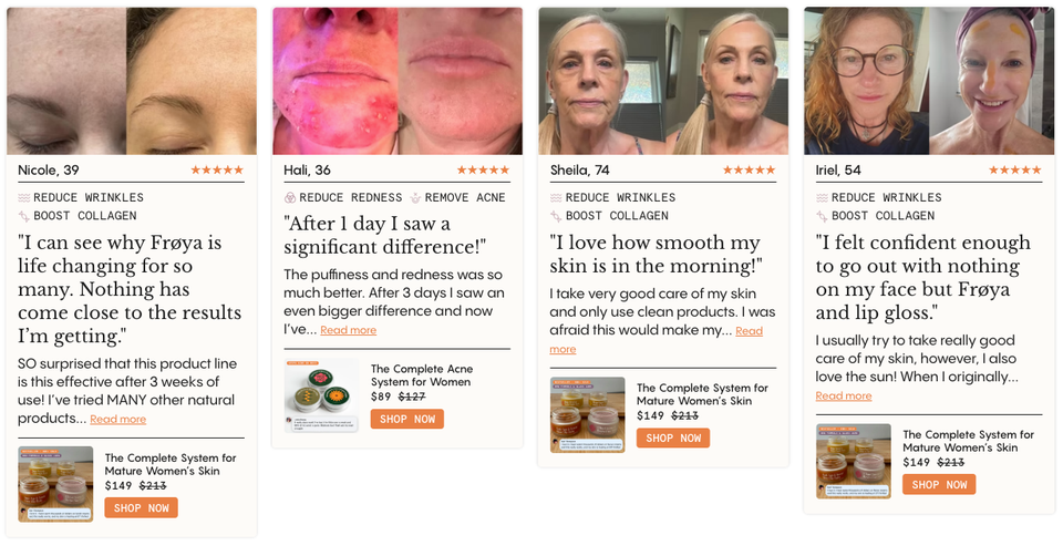 Froya Organics - Better skin in 60 days or money back. In Frøya’s realm, where sky meets earth, She harvests herbs of ancient worth. Her hands weave fate, the leaves she takes, From fields that glow as daylight breaks. Her potions mix with northern light Ease pain of day and soothe the night. In jars that hold the forest’s balm, All ailments bow to Frøya’s calm. By twilight's fire, her elixirs made, Outshine the morning's freshest glade. Drink deep, ye maidens, from her brew, And let thine ageless grace renew.